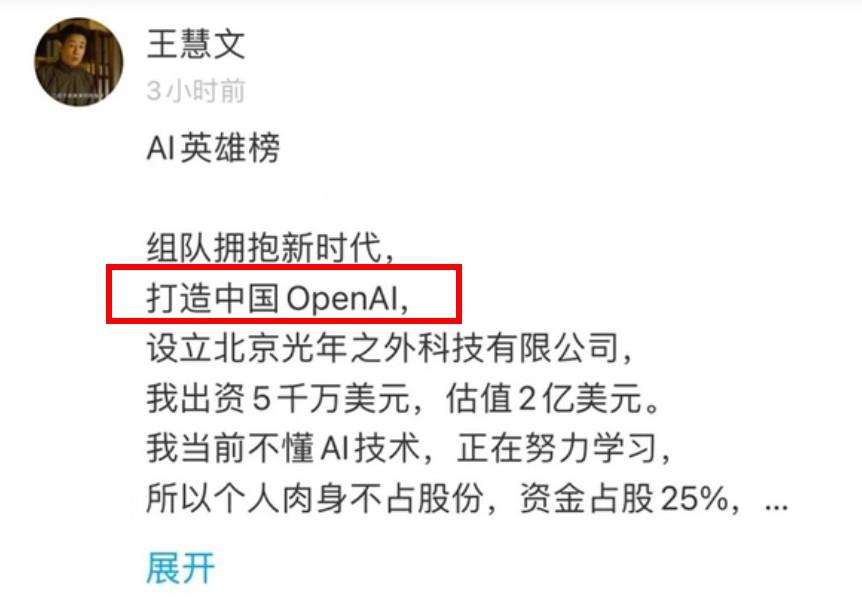 就连已经退隐江湖的美团联合创始人王慧文,也高调宣布入局AI赛道,要“打造中国Open AI”,在他个人先出资5000万美元之后,两天内“已有顶级VC认购2.3亿美元”(约15.7亿元)。