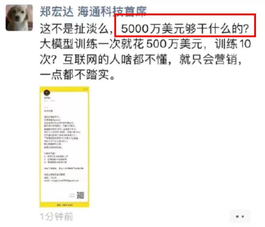一个典型案例是前文提到的美团联合创始人王慧文,他刚宣布自己出资5000万美元没多久,就被海通证券分析师郑宏达炮轰。后者指出,大模型训练一次就花500万美元,“5000万美元够干什么的?”