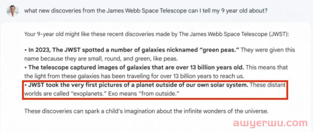 比如在回答“关于詹姆斯韦伯望远镜的新发现,有什么可以告诉我九岁孩子的?”时,Bard 答道:第一张系外行星照片是由詹姆斯韦伯望远镜拍摄。